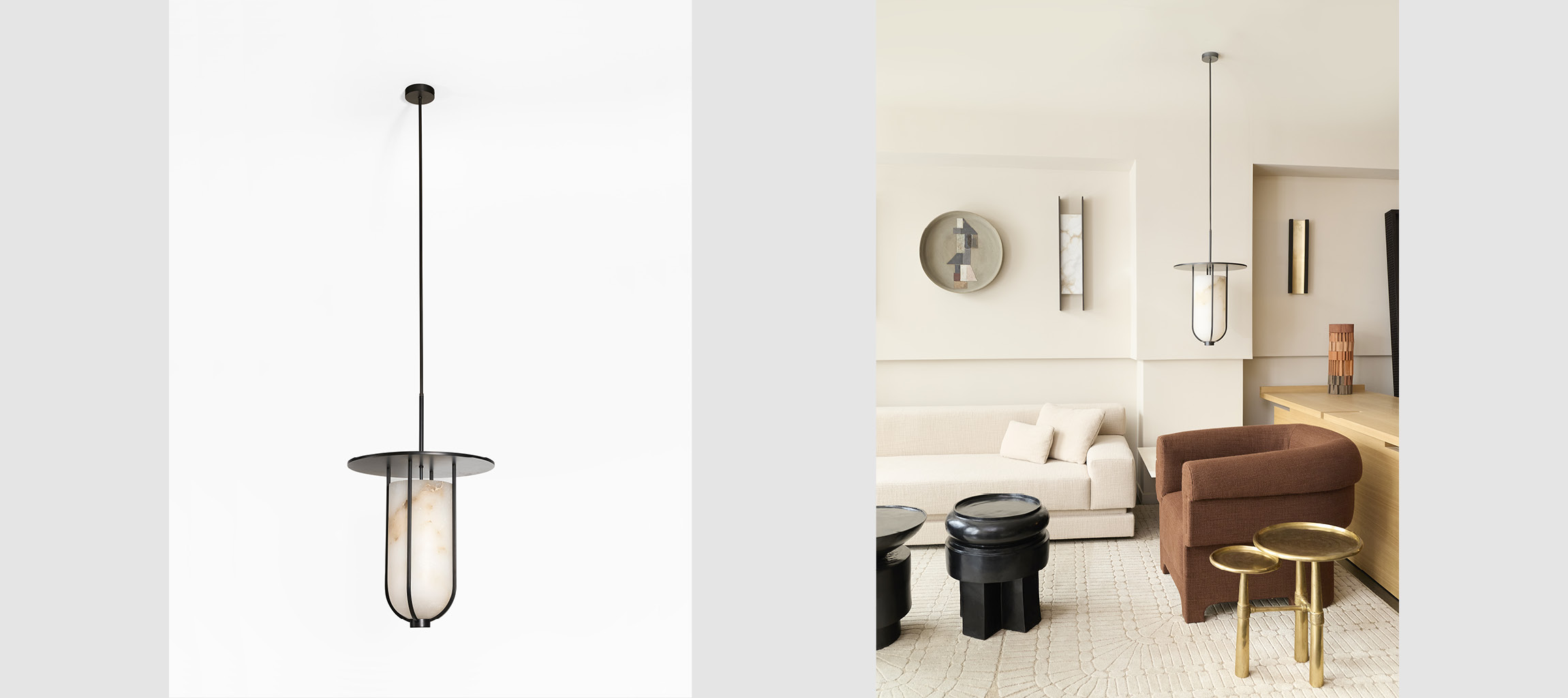 Suspension Chapeau | Albâtre et métal finition bronze foncé | Ø 45cm